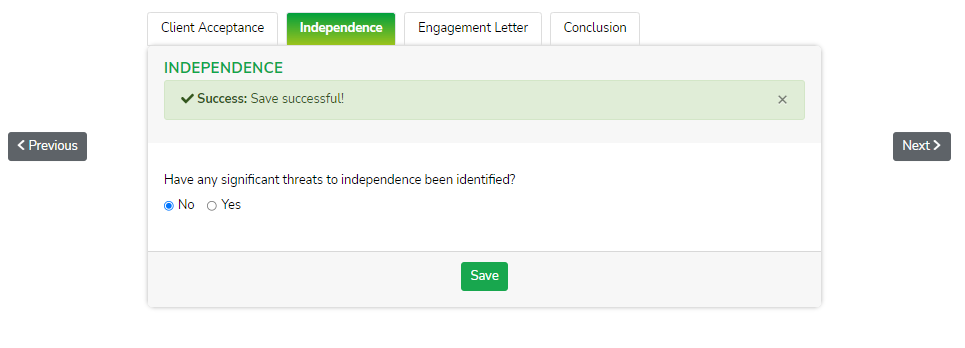 Once completed, sign the Conclusion section and use the right most navigation button to "complete" the section. Completing a section will transfer specific relevant data to the next workflow (if necessary) and will change the status of the engagement.